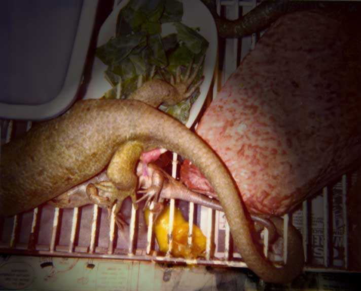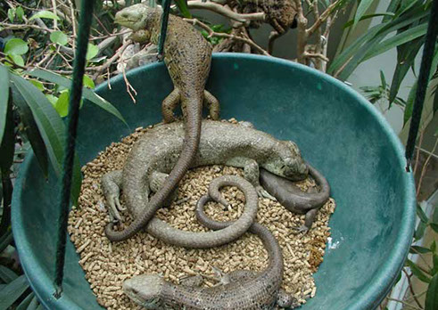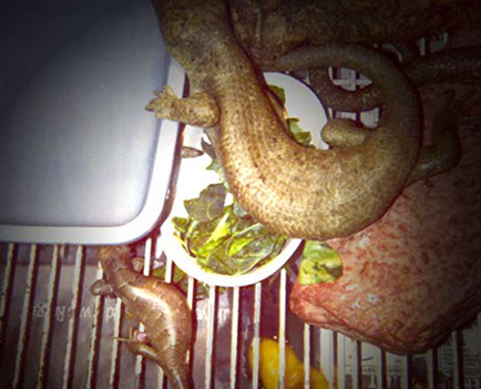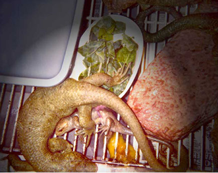 Pregnant females seem to seek out cooler areas of the enclosure. One in particlular has babies usually in Feburary and March in San Diego, the coldest part of the year.Pregnant females sometimes will soak in their water dishes 2-3 days before delivery and the babies are usually born at night.